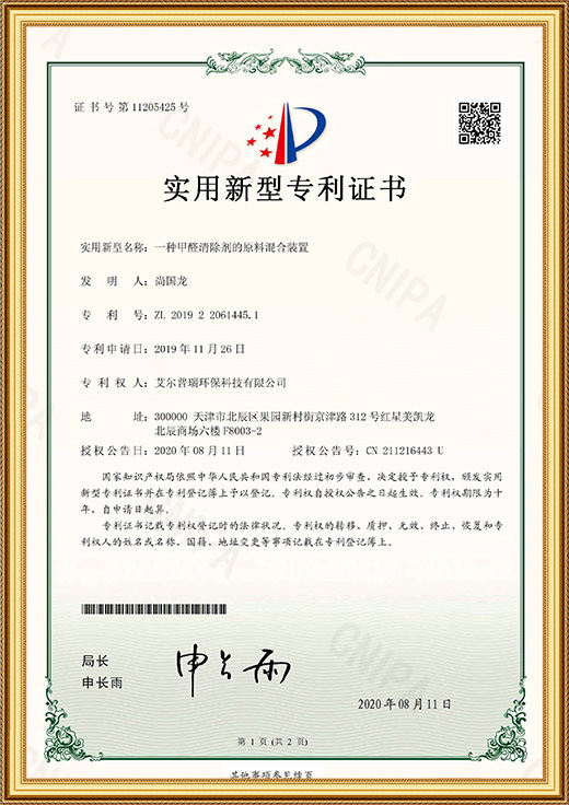 • 實用新型專利證書(一種甲醛清除劑的原料存儲